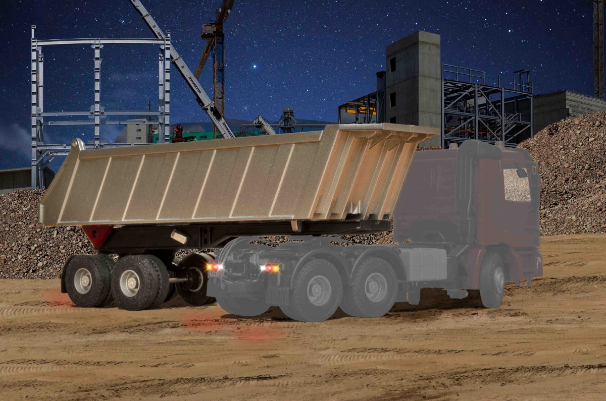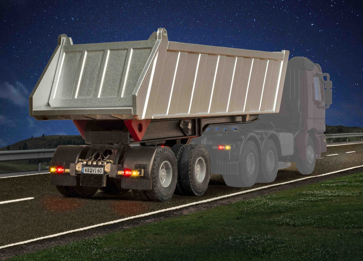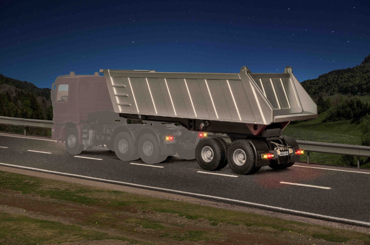 | Past perfect bij art. 8011 en 8030 MB ACTROS 3-assige oplegger. De oplegger met achterverlichting heeft een 5-polige stekkeraansluiting om verbinding te maken met het betreffende voertuig. Door de aansluiting op de trekker worden de volgende functies overgedragen: • Infraroodzender voor afstandsregeling • Remlichten en achteruitrijlichten • Richtingaanwijzers rechts/links en alarmknipperlichten bedienbaar L 9,8 x B 2,8 x H 3,8 – 8,6 cm |