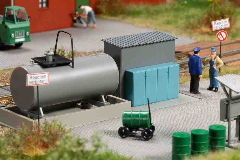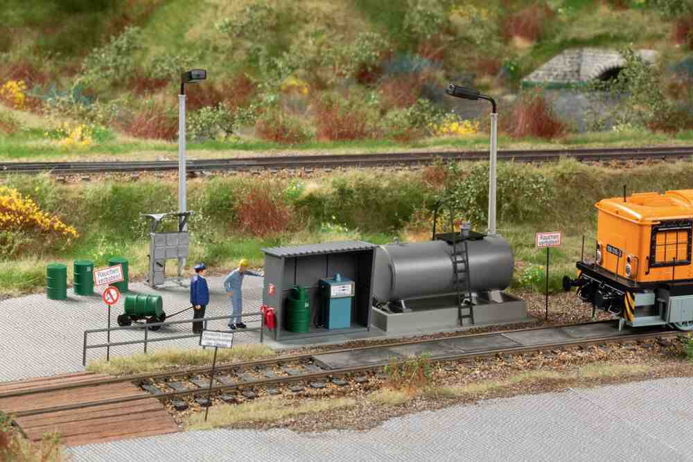 Der ab den 1930er Jahren beginnende Einsatz von Kleindiesellokomotiven im Rangierdienst auf Bahnhöfen oder auch in Industriebetrieben erforderte die entsprechenden Behandlungsanlagen. Das authentische Modell einer in den 60er Jahren modernisierten Tankanlage mit Kraftstoffkessel, wettergeschützter Tanksäule, Ölvorratswagen und Schmierstofflager lässt sich ideal mit unserem Artikel 11 429 Kö-Schuppen kombinieren.