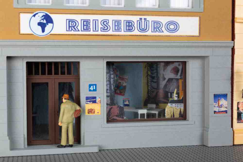 Auch das neue Reisebüro wartet neben der klar strukturierten neuen Fassade, der Hinterhofgestaltung mit Fahrstuhlschacht und der Ladeneinrichtung mit einer Erweiterungsmöglichkeit auf: Hier ist ebenfalls während der Bausatzmontage die Ergänzung einer Leuchtreklame Artikel 58 102 LED-Beleuchtung Reisebüro möglich. Natürlich ist bei beiden Gebäuden auch die Ausrüstung mit der jeweiligen anderen Reklame möglich.