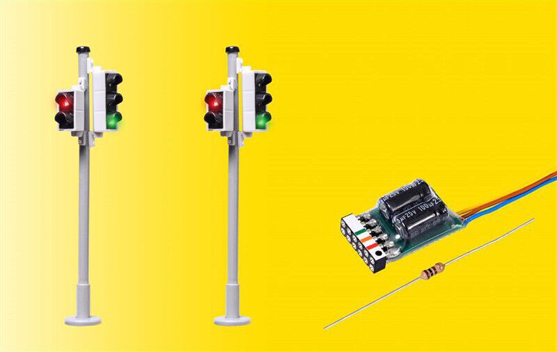 Deze set bestaat uit 2 verkeerslichten met elk een rode, gele en groene led voor het wegverkeer en een rode en groene led voor de voetgangers. Bijvoorbeeld voor voetgangersoversteekplaatsen. Voorbeeldgetrouwe messingmast met patentsteekvoet voor eenvoudige montage. Met de meegeleverd elektronica worden de verkeerslichten in een vast wisselritme aangestuurd. De nachtstand is ook te schakelen, dan knipperen alleen de gele lichten.