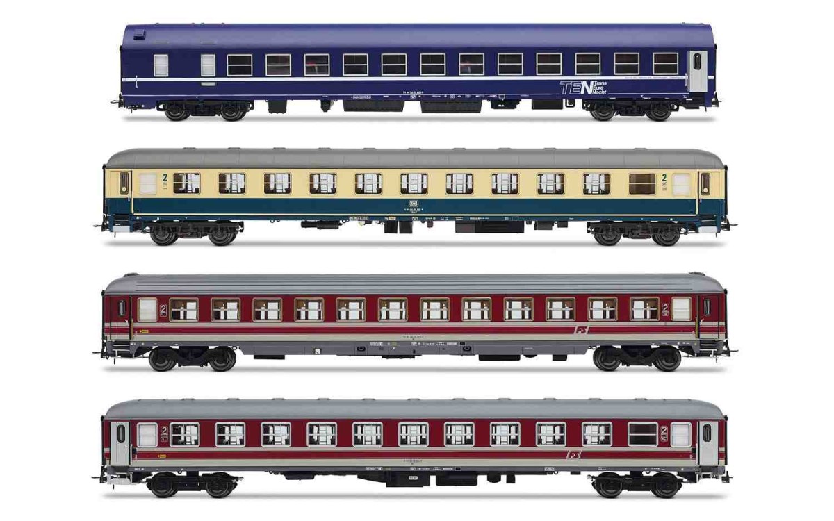 Rivarossi HR4374 FS/DB/NS, 4-unit pack 1 "Italien-Holland-Express", NS WLABm MU TEN, DB Bcm 243 blue-beige, FS UIC-X 2nd cl. red-grey + FS UIC-X '68 couchette red-grey, ep. V